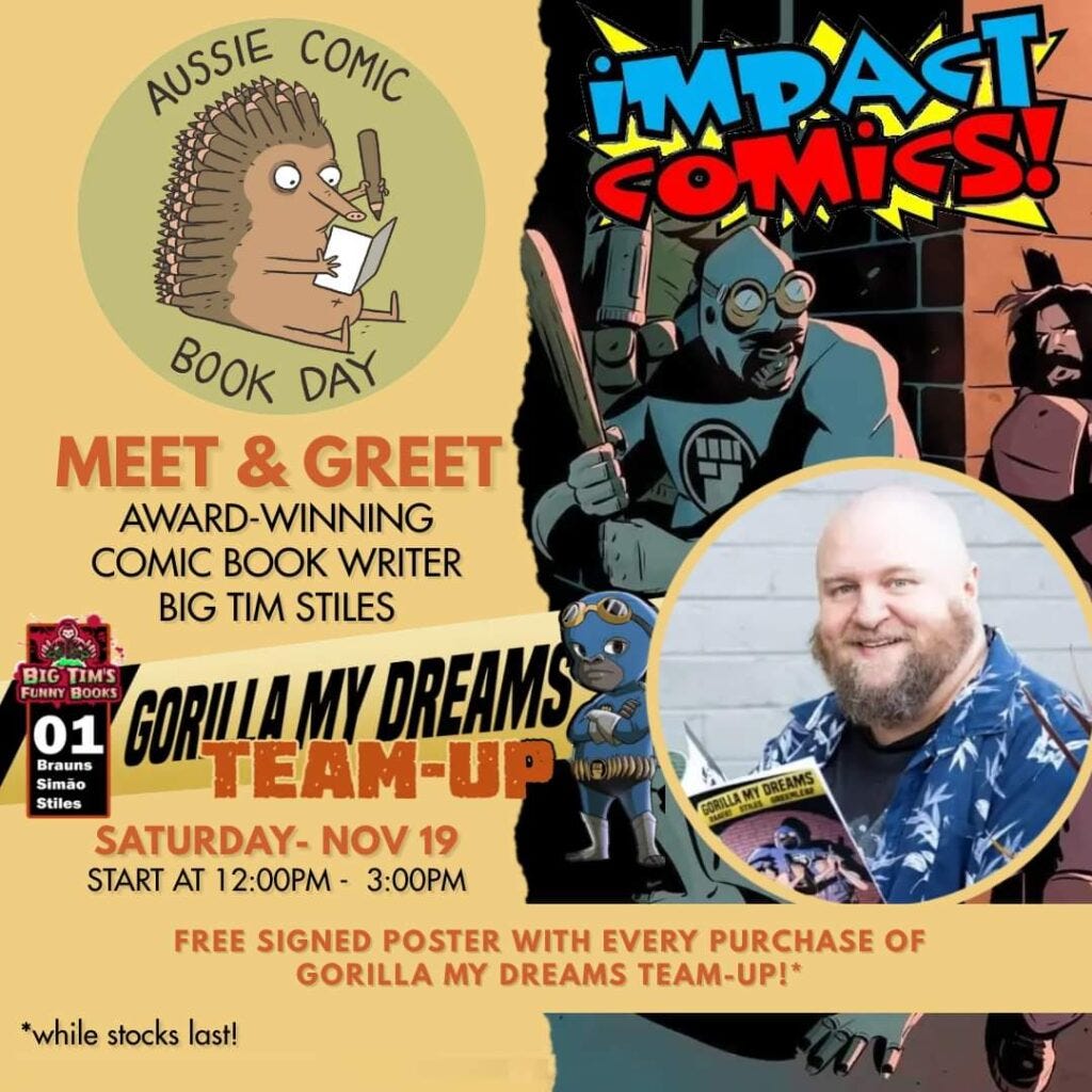 Aussie Comic Book Day at Impact Comics will be the the first stop of a three weekend tour of Canberra to celebrate the phisical launch of GORILLA MY DREAMS TEAM-UP #1! I’'ll also be bringing a limited number of free posters to sign and give away with a GORILLA MY DREAMS purchase!