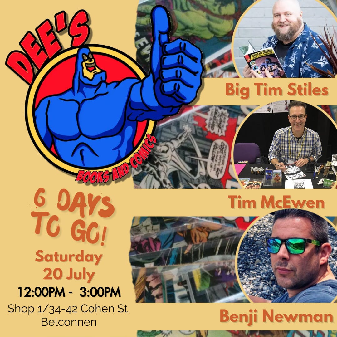 I rallied a couple of my comic book making mates, and we’re having a signing THIS SATURDAY at Dee’s.